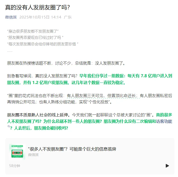 同时,微信公关总监也在微信派播客中回应“很多人不发朋友圈了、朋友圈是不是真的凉了”的言论表示,这是个人的感受,有点像信息茧房。